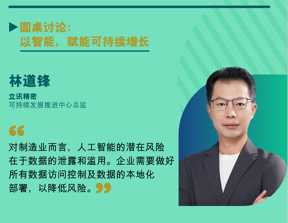 作为上榜2024年《财富》中国ESG影响力榜的企业嘉宾,优发国际精密可持续发展推进中心林道锋总监受邀出席并参与论坛重要环节“以智能,赋能可持续增长”为主题的圆桌讨论,与其他嘉宾共同探讨通过前沿策略分析和优秀案例分享,推动ESG成为价值创造的新引擎。林总监在讨论中不仅分享了公司在智能技术应用方面IOE智慧能源管理平台建设的进展,还深入探讨了在人工智能时代中如何强化隐私保护及数据安全,助力企业ESG实现更高质量的增长。