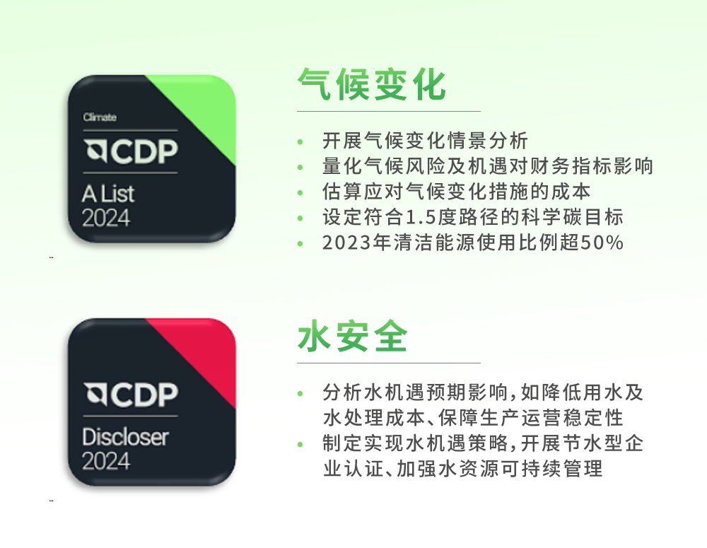全球环境信息研究中心(CDP)评级,被广泛视为衡量企业环境透明度和可持续发展行动的重要基准,覆盖全球超22000家公司。近日,CDP公布2024年评级结果,优发国际精密评级连续四年稳步提升,在气候变化领域获评「A」级、水安全领域获评「A-」级,双双位列全球领导力等级,这一突破高度认可了优发国际精密在气候变化的应对和水资源的可持续利用方面的努力和成果。